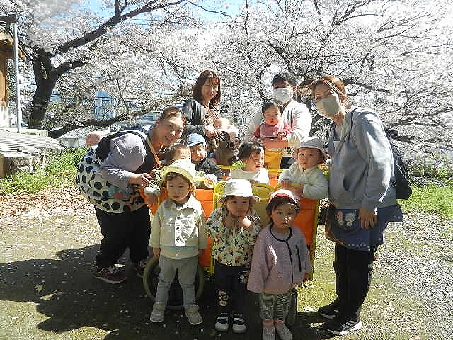 桜が満開でとてもきれいでした。風が吹くと花びらが散ってそれもきれいで、花びらを拾って楽しむ子とも出来ました。