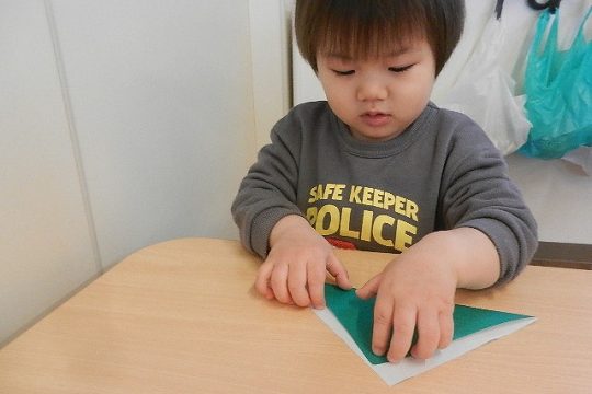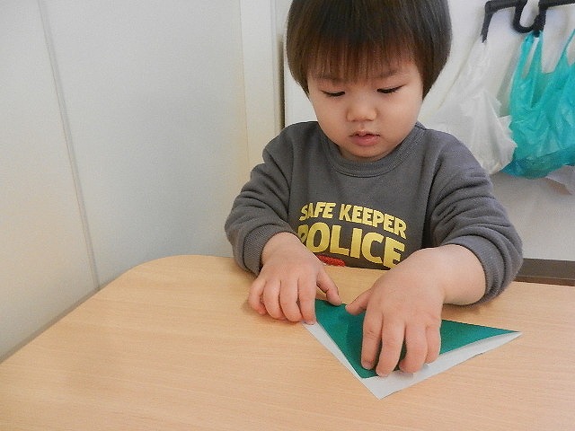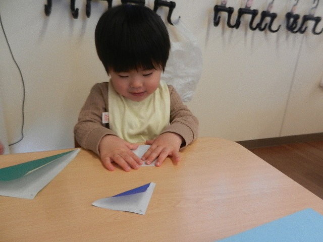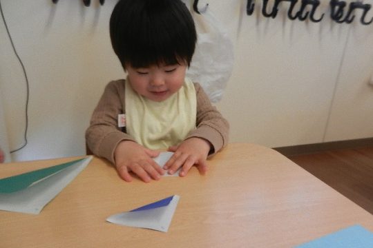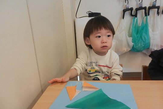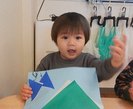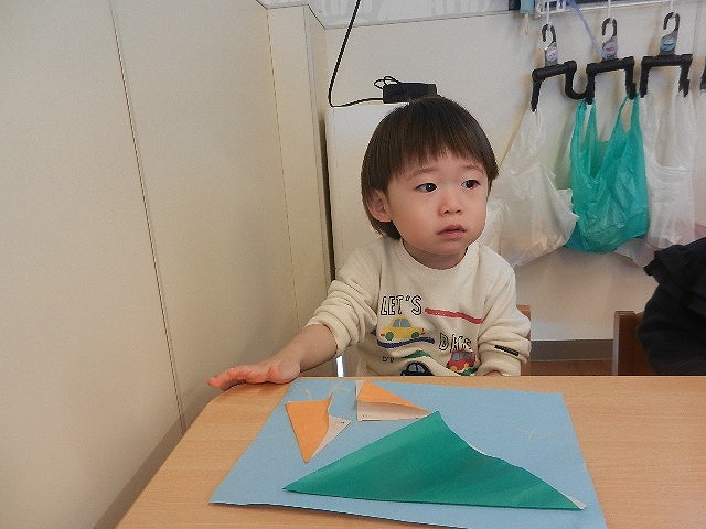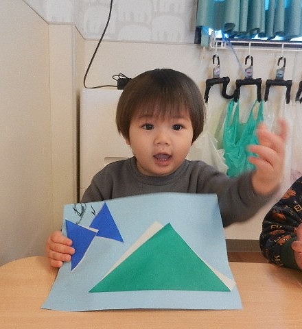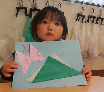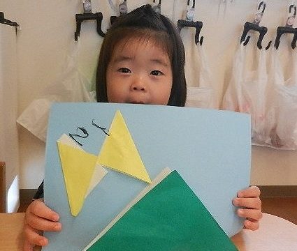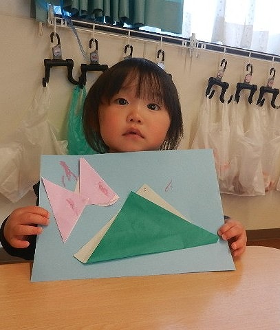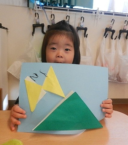 折り紙で三角を折って山とちょうちょうにしました。