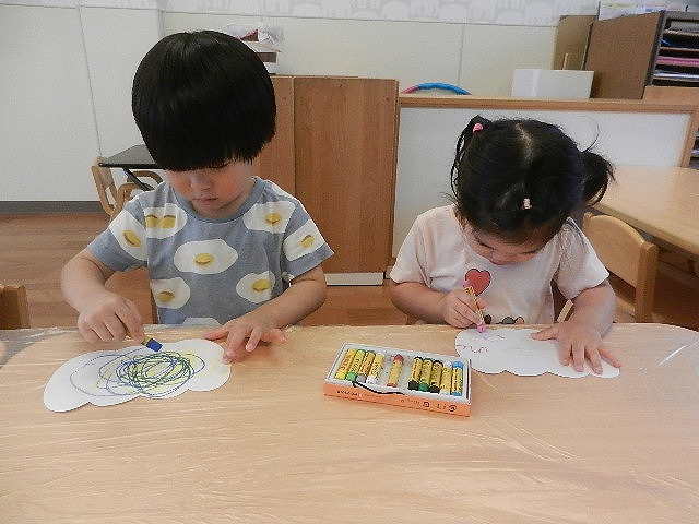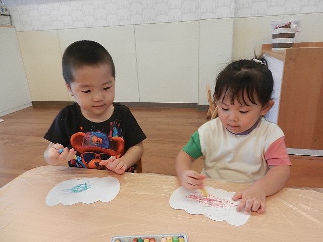 クレヨンで絵を描いてはじき絵にしました。その上にパーツを貼りました。