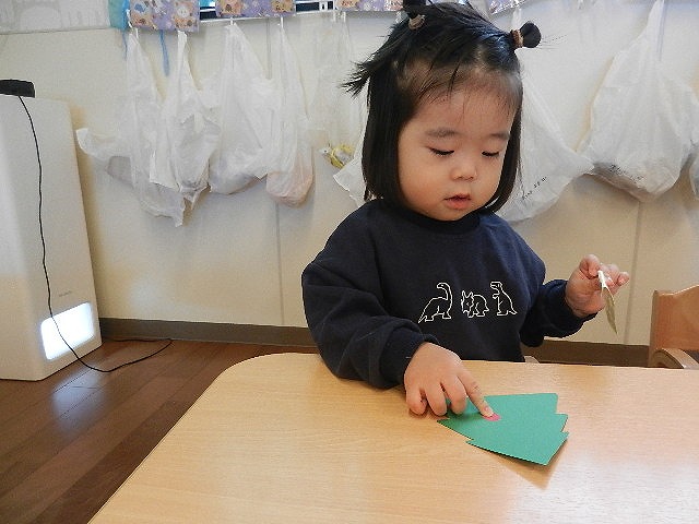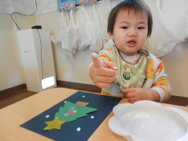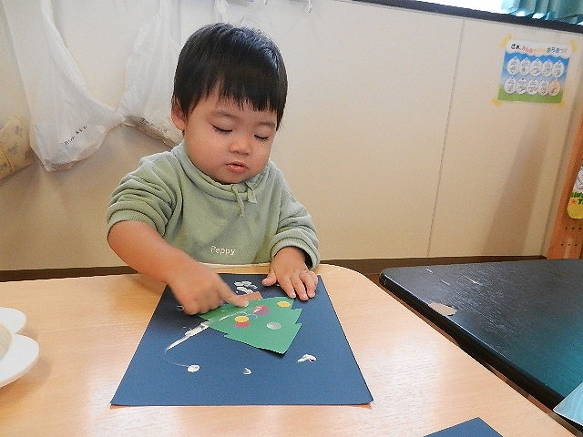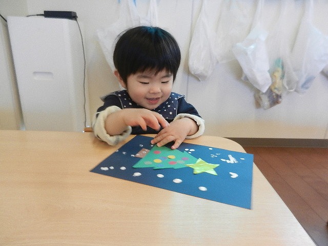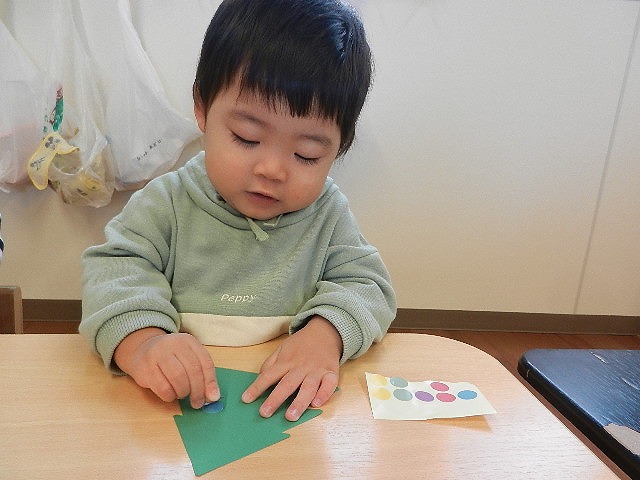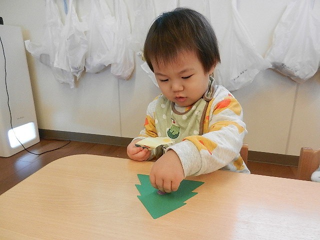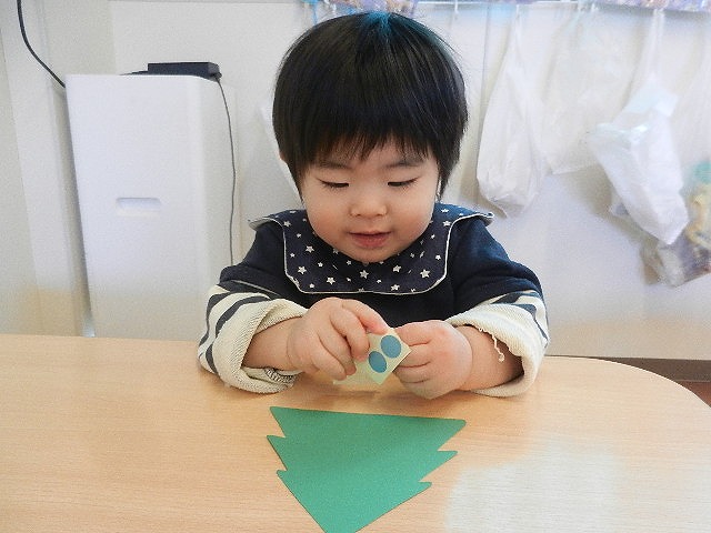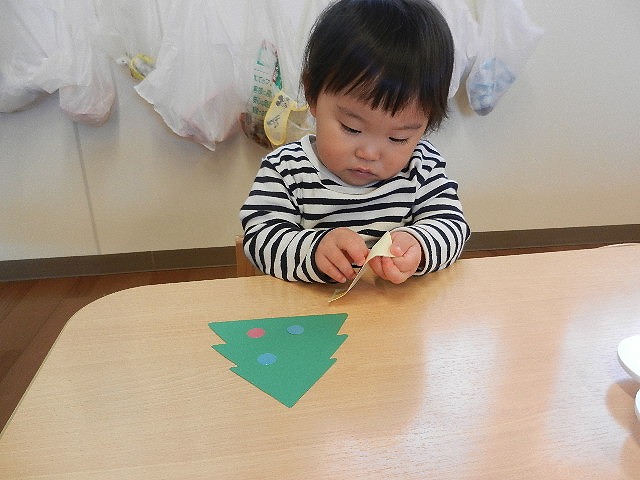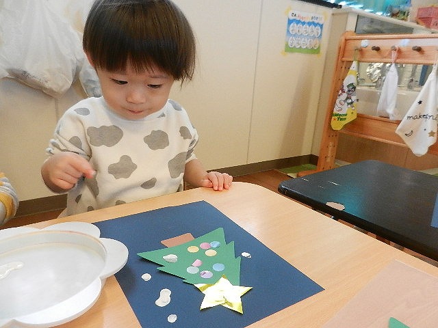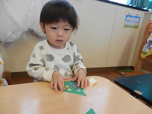 シールや指スタンプをしてクリスマスツリーを作りました。